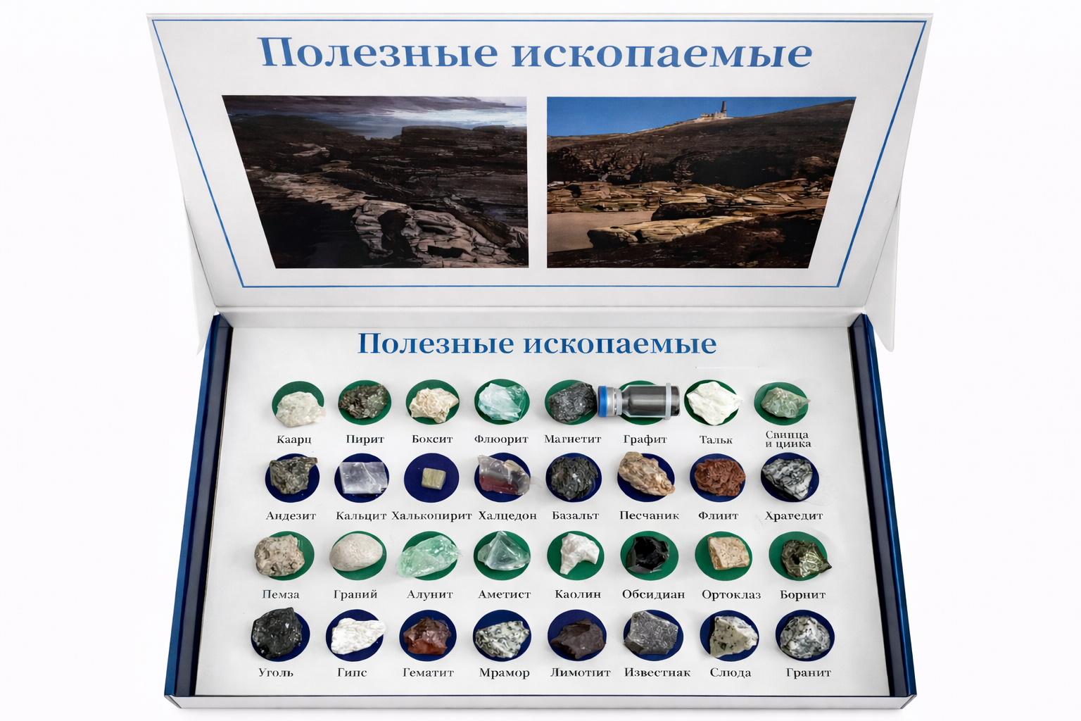 - Наглядное учебное пособие для изучения свойств, внешнего вида и классификации полезных ископаемых.