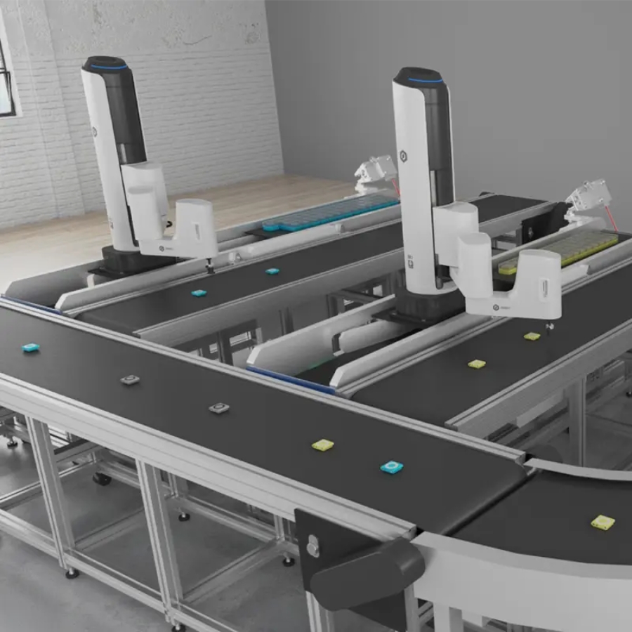 Автоматизация линии: Робот может выполнять задачи на движущемся конвейере (pick-and-place) благодаря возможности отслеживания движения ленты через энкодер .