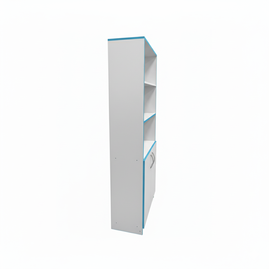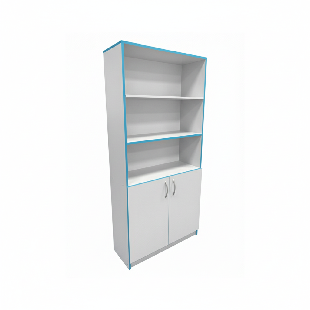 Верхний Корпус: открытые регулируемые полки предназначены для хранения и демонстрации. Нижний Корпус: закрытые регулируемые полки для организованного и защищённого хранения. Представляет собой закрытую секцию с полками, предназначенную для безопасного хранения материалов и принадлежностей. Секция оснащена распашными дверями, установленными на металлических навесах с доводчиками, что обеспечивает плавное и бесшумное закрывание и предотвращает хлопание при эксплуатации. Замок: Для ограничения доступа корпус шкафа оснащён замком, что позволяет использовать его для хранения ценных, служебных или учебных материалов.